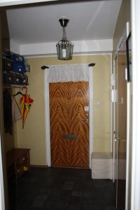 Har gjort ett tappert försök att ta bort något av den fula ytterdörren med en gardin. Men funderar satt skaffa något ljusare.