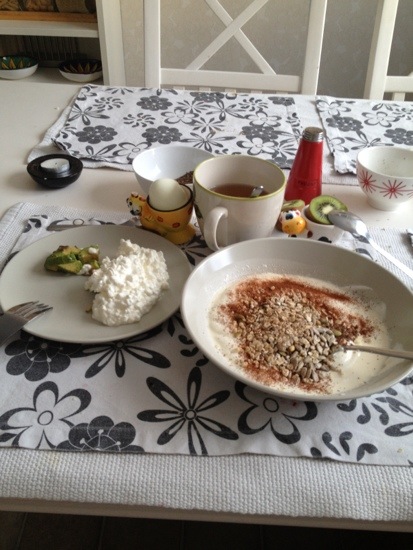 Körde lite hemma träning när jag gick upp, lite planka och sånt. Efteråt åt jag en jättefrukost igen. Minns att jag under en period alltid åt stora frukostar (trots illamående på morgonen) och jag under den perioden faktiskt mådde mycket bättre. Svårt det där med vilken del av dagen som man ska äta som mest på, vissa tycker lunchen men de flesta är överens om att middagen ska vara minst. Min kropp föredrar trots illamående att få mest mat på morgonen och mindre resten av dagen.