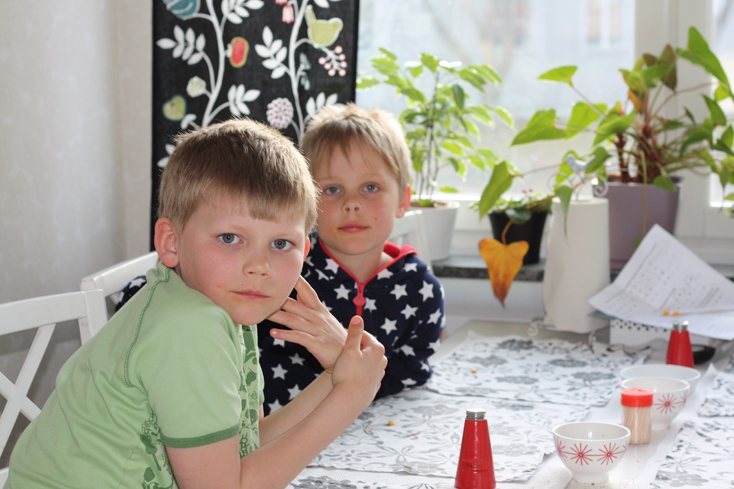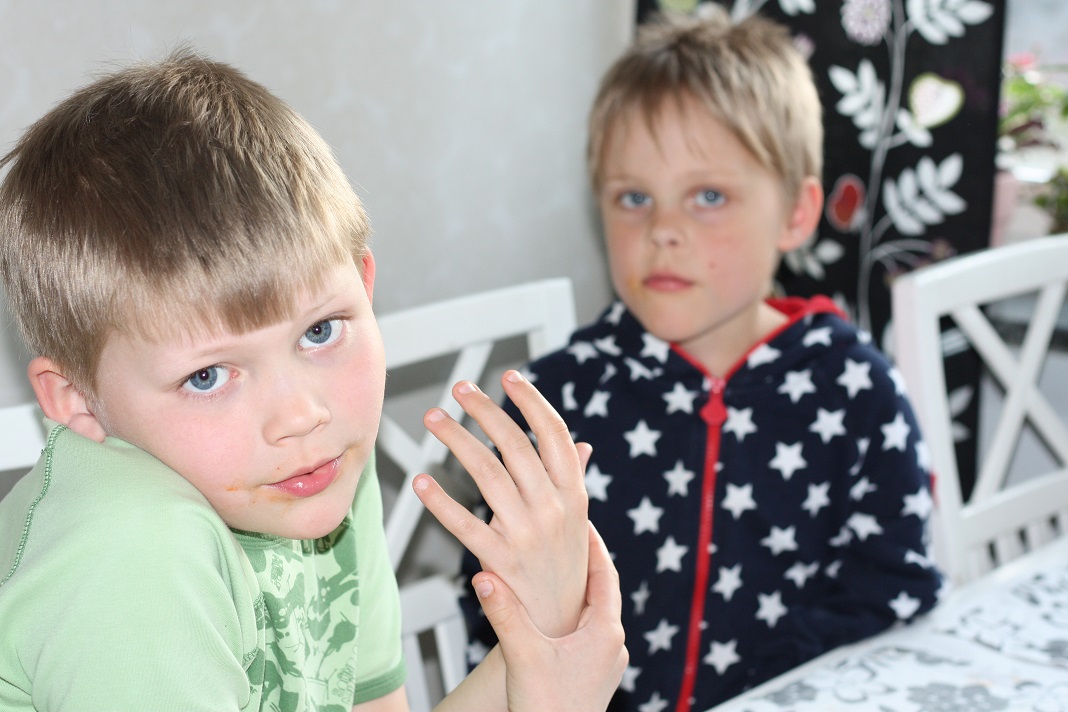 Barnen hade just ätit middag här där jag serverade tacos därav mat på kinderna. Tacos är ju inte direkt den middagen som man förblir ren på.