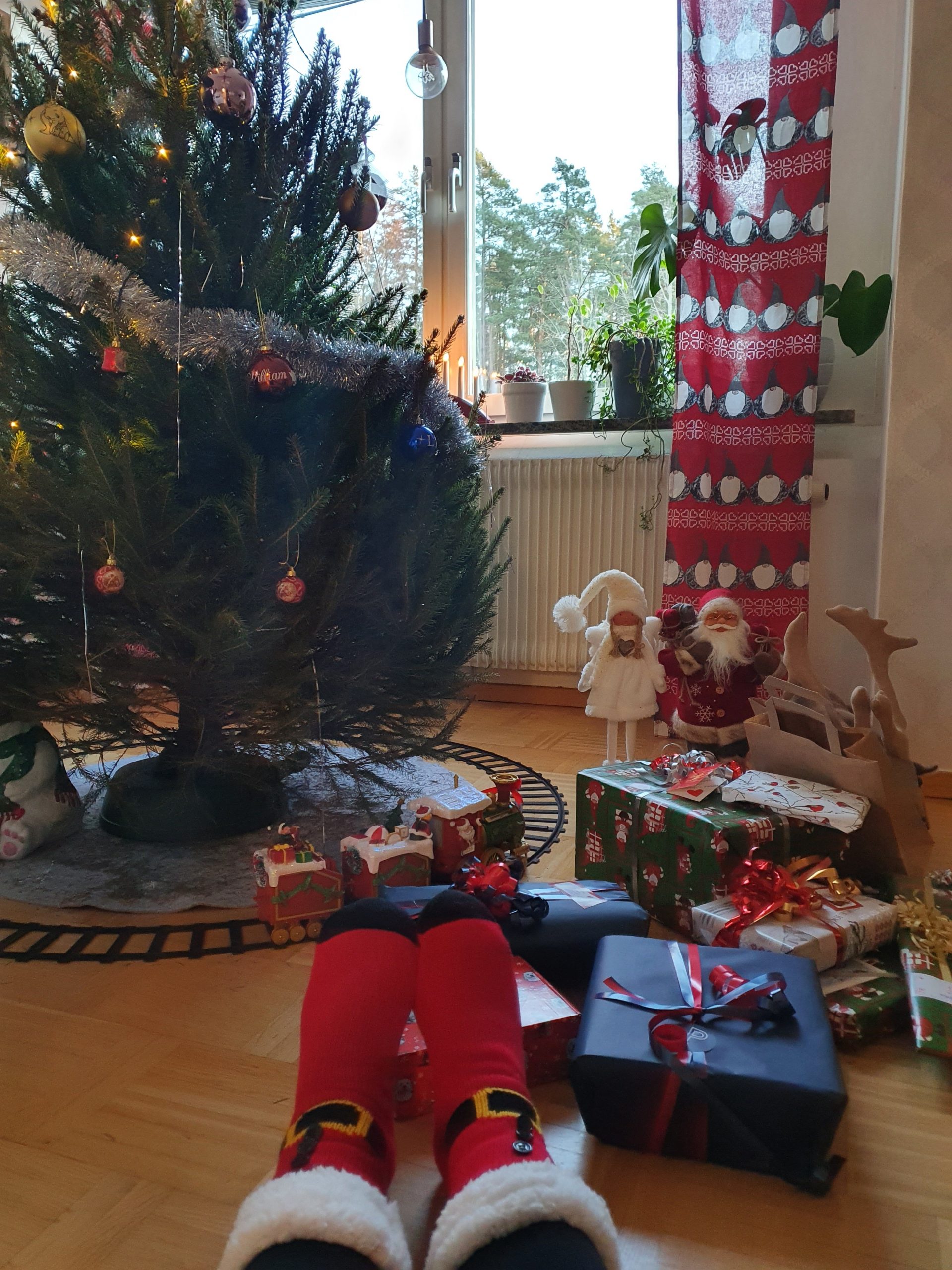 Vår julafton 2020. Skilla redo för julen med tomteluva, och jag med julstrumpor. En liten glimt får ni allt! Jag berättar mer om någon dag.