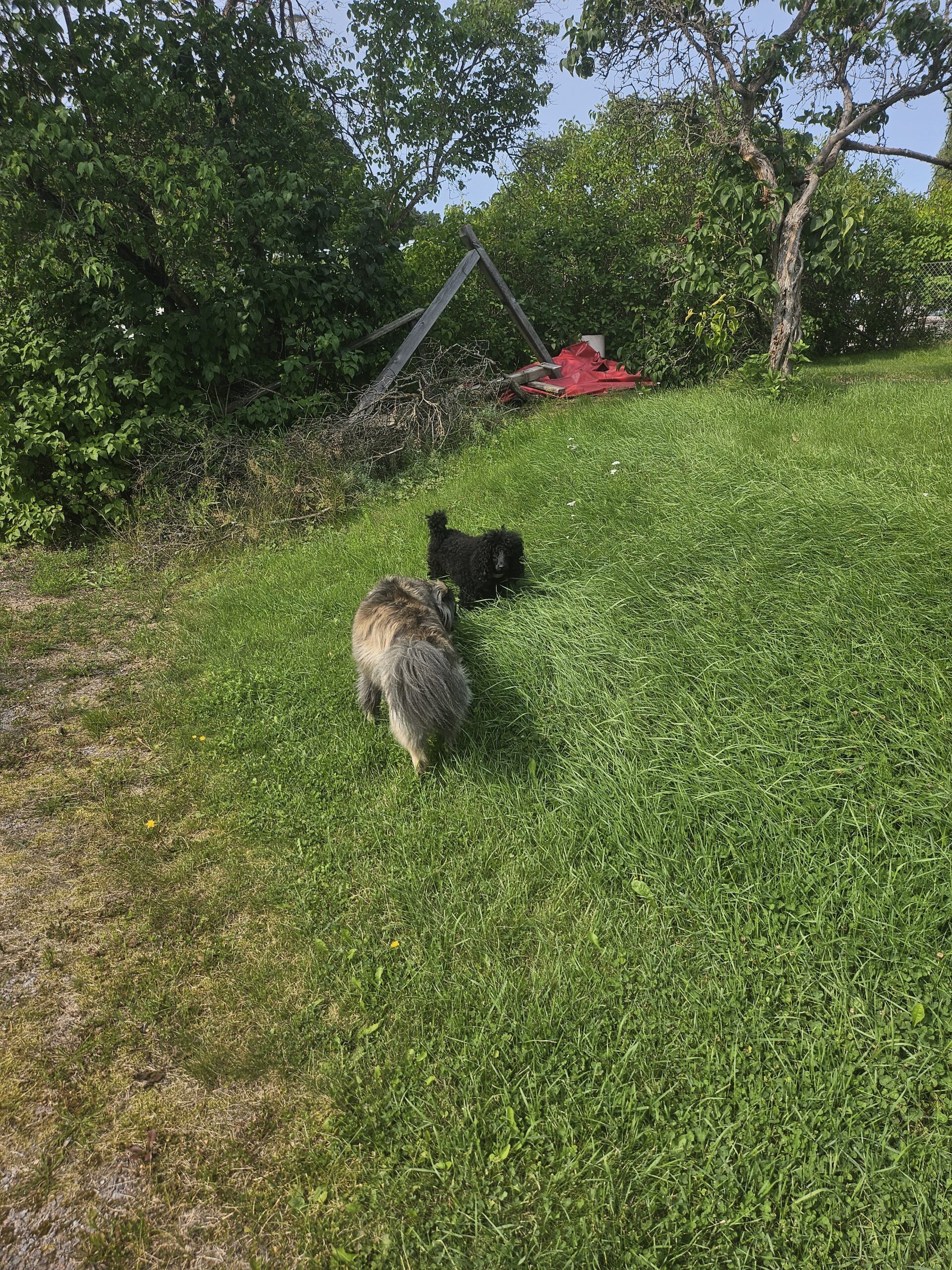 Väl tillbaka fick de leka ute tillsammans en stund, det sprang och lektes och sedan blev det lite gräsätning och vilandes i gräset. Efter det gick jag in med två trötta hundar som somnade ganska omgående.
