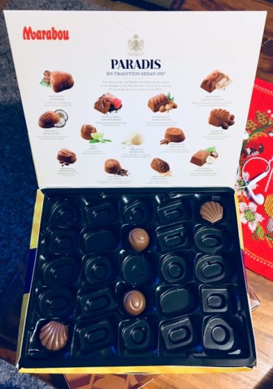 Ni vet när man öppnar locket på en chokladask som senast var full och ser detta. Man börjar ganska snart fundera på hur en full ask kan förvandlas till halvtom. Ännu mera mystiskt är det när det endast är fyra oätliga bitar kvar…