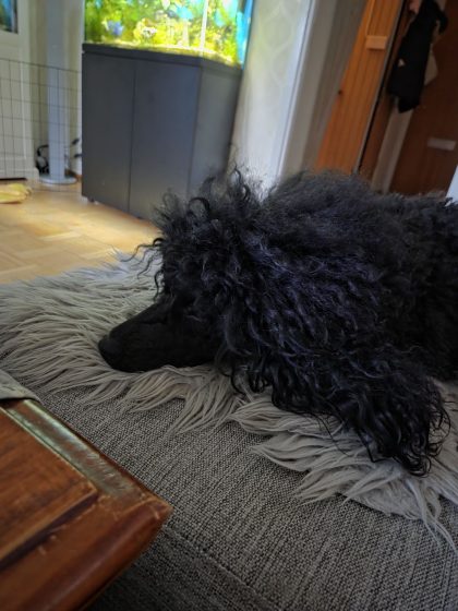 Så var det måndag igen. Blir som vanligt en promenad med Lizzla men lite senare under dagen. Ska alldeles strax duscha, och utanför hörs bygget av den nya sopstation som ligger vid ytterdörren. Ser inte alls framemot augusti när kräftsäsongen är igång… Ser heller inte framemot mitten av juli när alla förbannade flugor vuxit till sig, och deras vidriga larver ska vara vad man möts av både inne och ute placeringen är så sjukt dum.